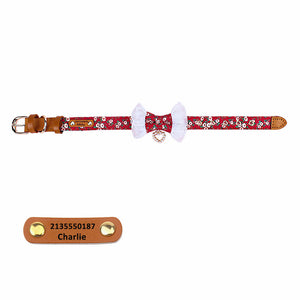 Custom engraved dog collar with a bow accent that adds charm and personality.