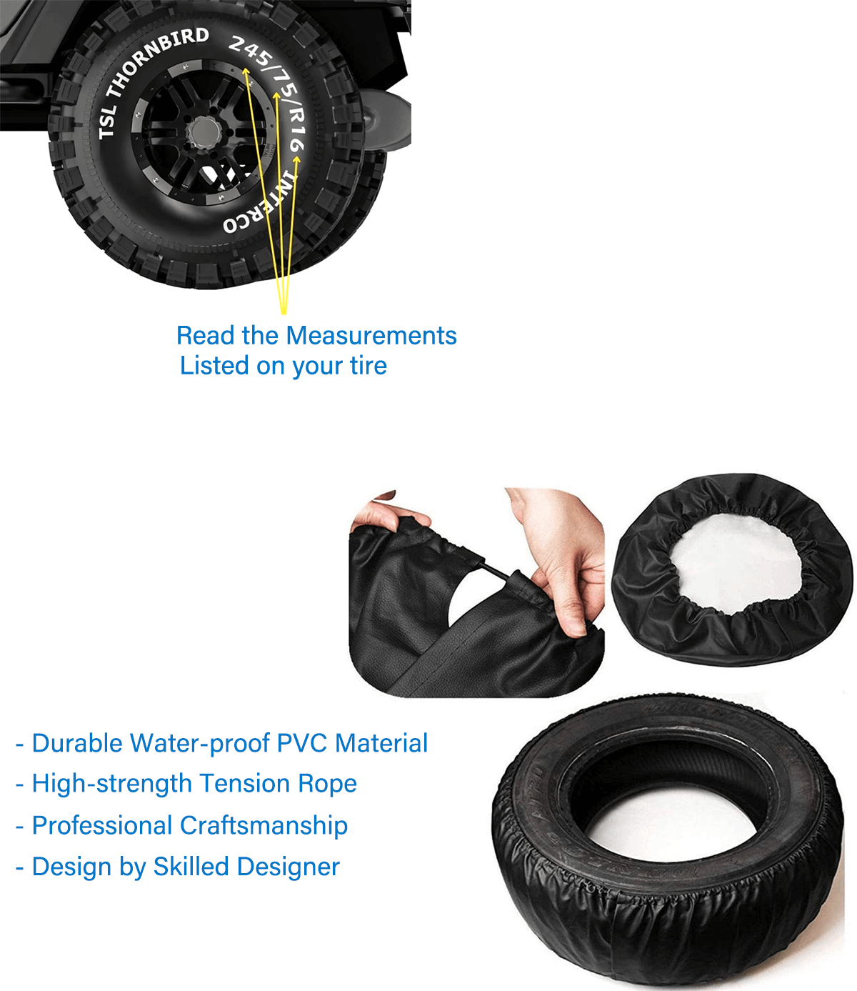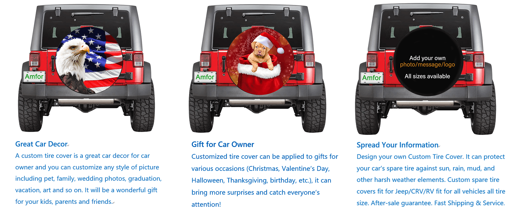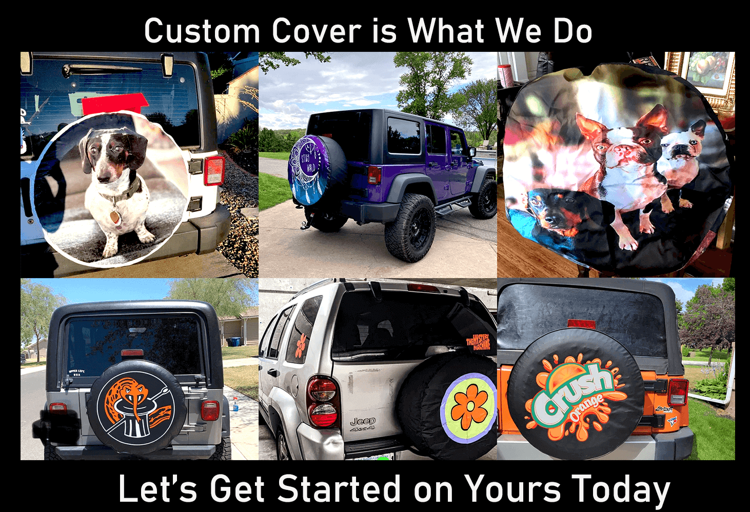 Personalized Custom spare tire cover. All you need to do is upload your image, logo, text, ...whatever you have. You can adjust the angle on the preview. The design will be a full color digital print so there is no limit to your choices. Each spare tire cover is custom made to your EXACT tire size. The image will not flake off like air brushed or painted tire covers.
