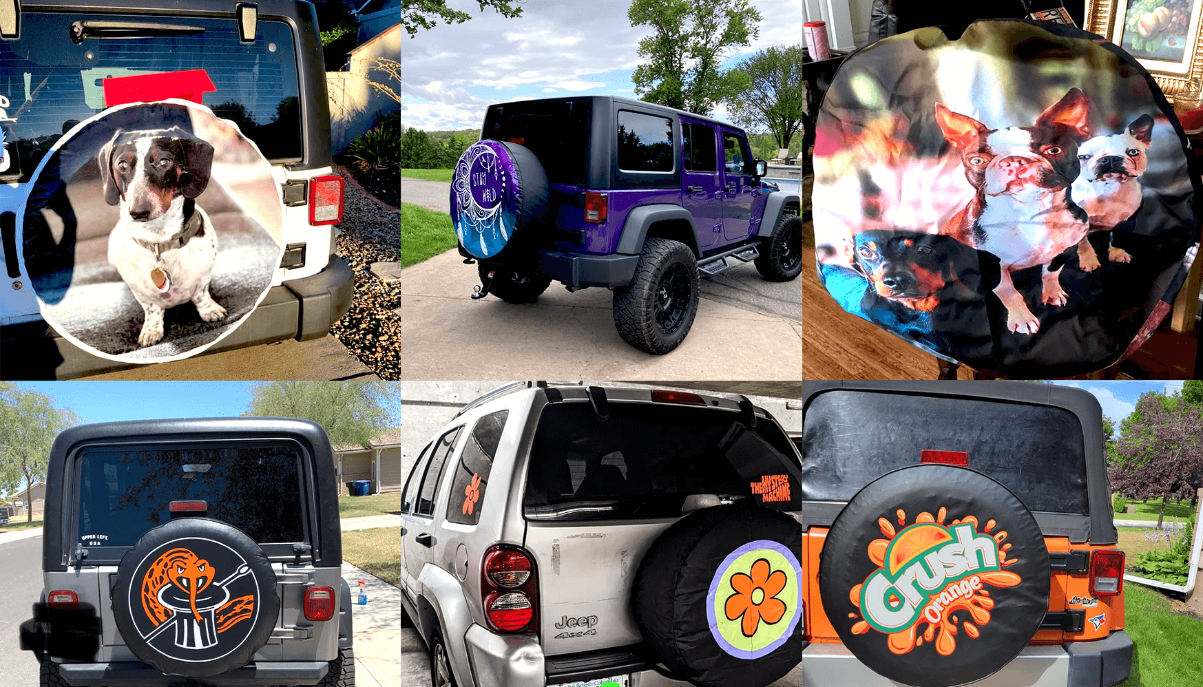 Personalized Custom spare tire cover. All you need to do is upload your image, logo, text, ...whatever you have. You can adjust the angle on the preview. The design will be a full color digital print so there is no limit to your choices. Each spare tire cover is custom made to your EXACT tire size. The image will not flake off like air brushed or painted tire covers.